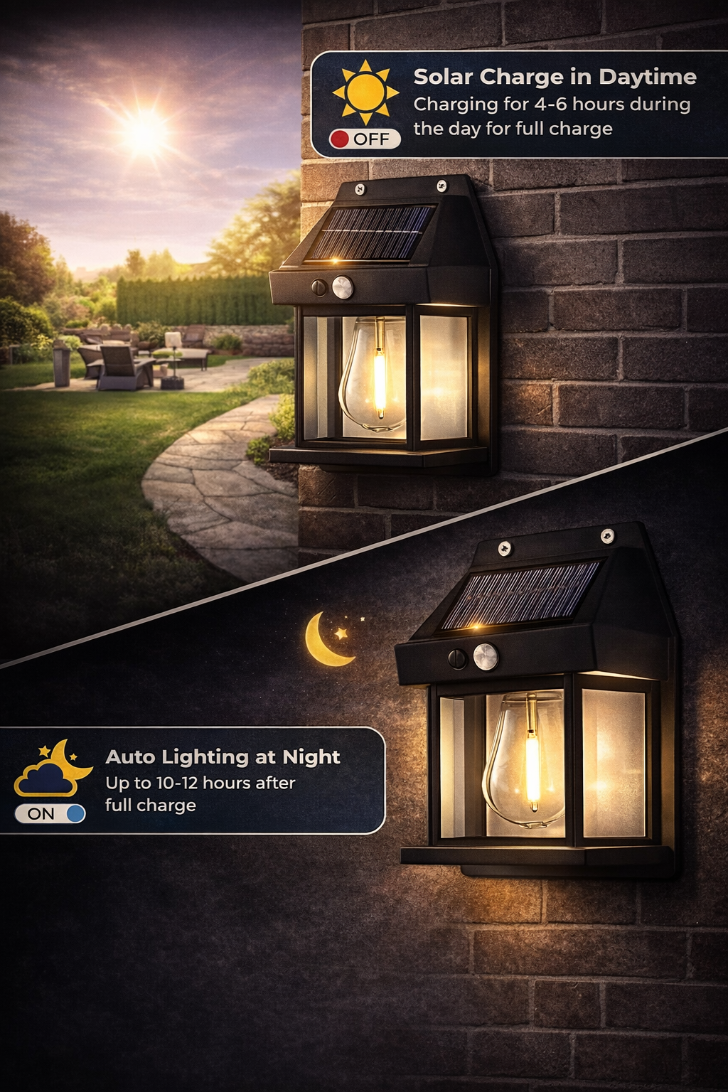 Smart solar wall light with motion sensor that automatically turns on at night.